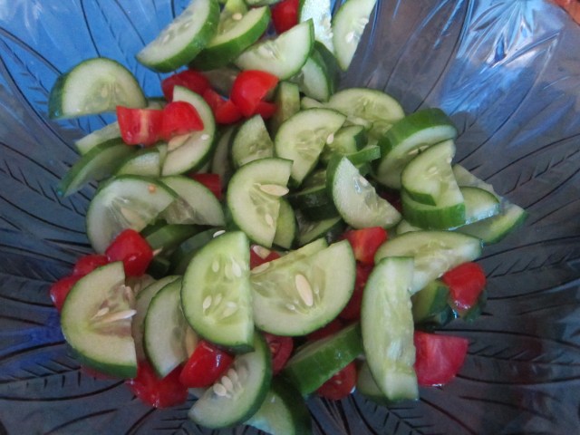 I’m not really one for exact measurements, especially with a salad like this – it’s very simple. Depending on how much you want to make, slice several cucumbers and then quarter them.