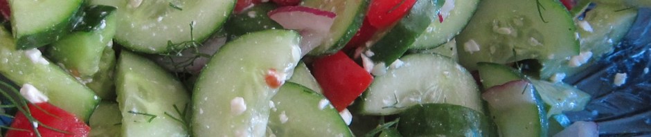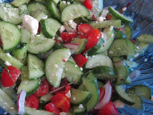Cucumbers are just starting to come into season in Maine – I picked up a bunch from Olivia’s Garden at the Farmer’s Market in Monument Square. Along with early cherry tomatoes, dill from the garden and feta cheese, this makes for the perfect hot weather salad