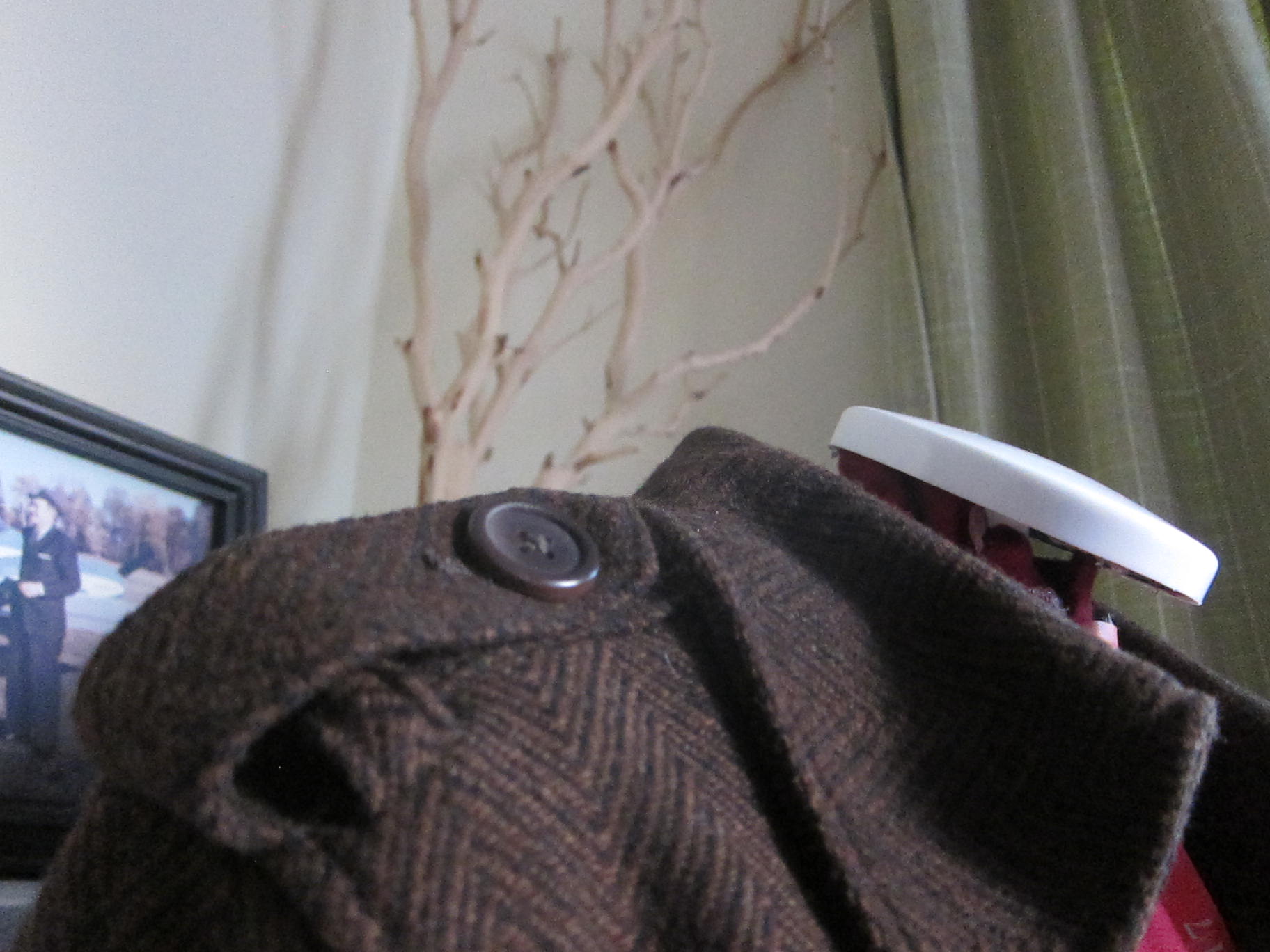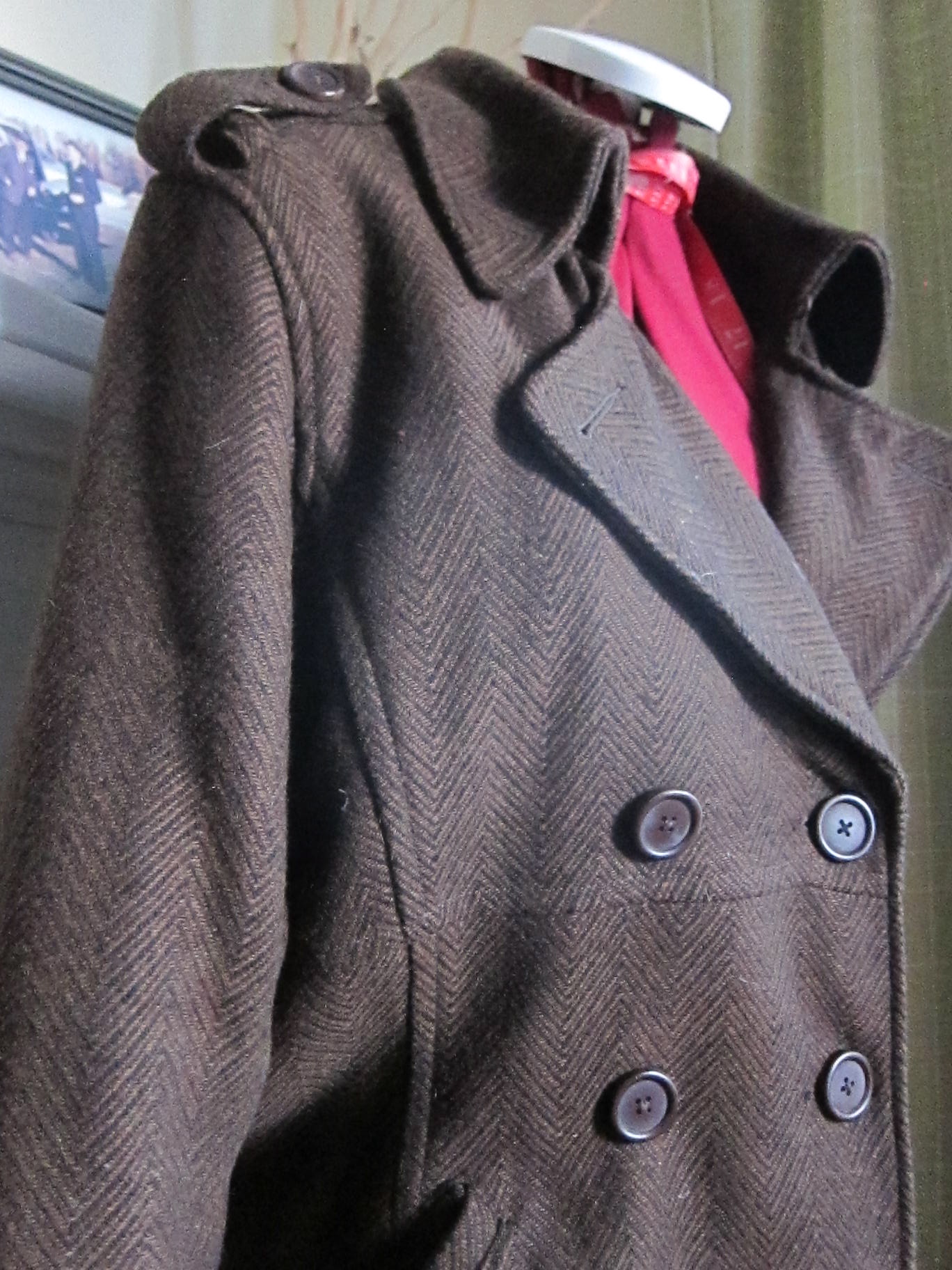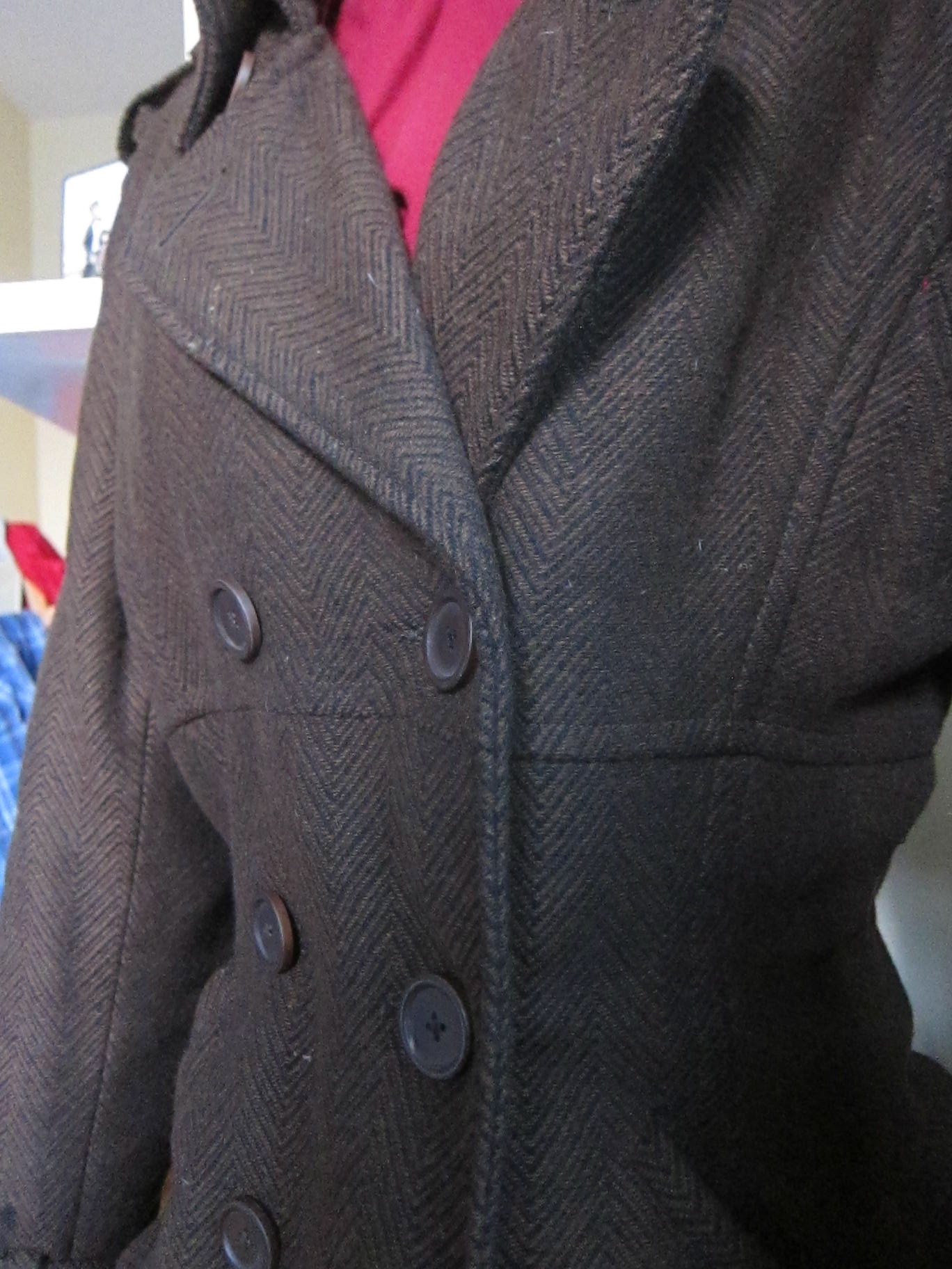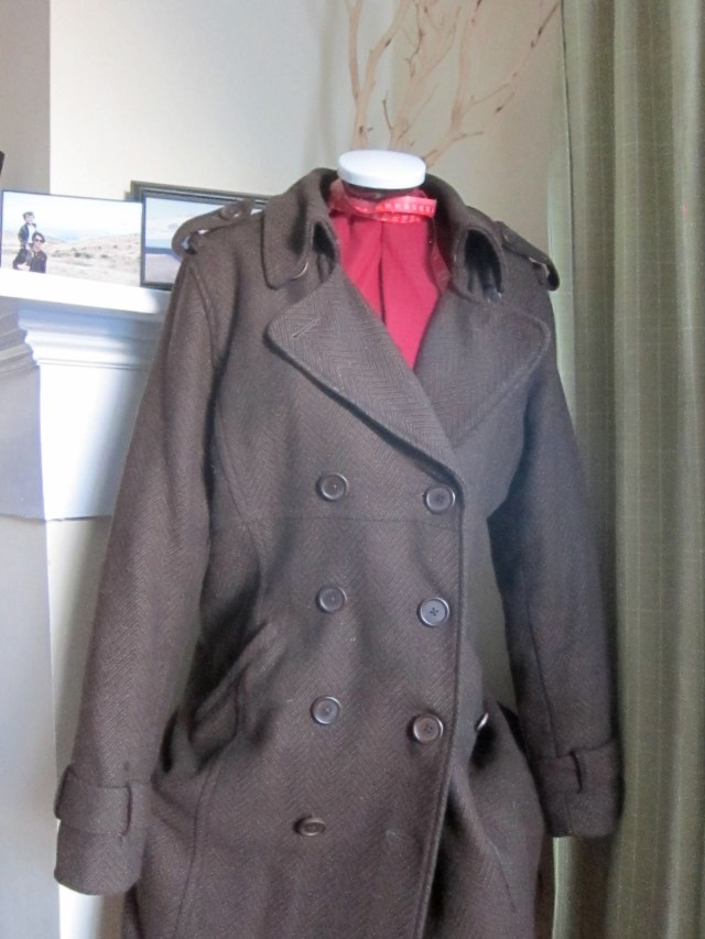 Well, I’m looking through and I stop at an innocent-looking brown pea coat. The quality of the fabric was high and in great condition – plus it was a long coat, something I’m always looking for to keep my whole self warm in the winter. I pulled it out and tried it on – it fit me to a T. All the buttons were in tact, it looked great, it was warm – sold! Bought it for $4.99.