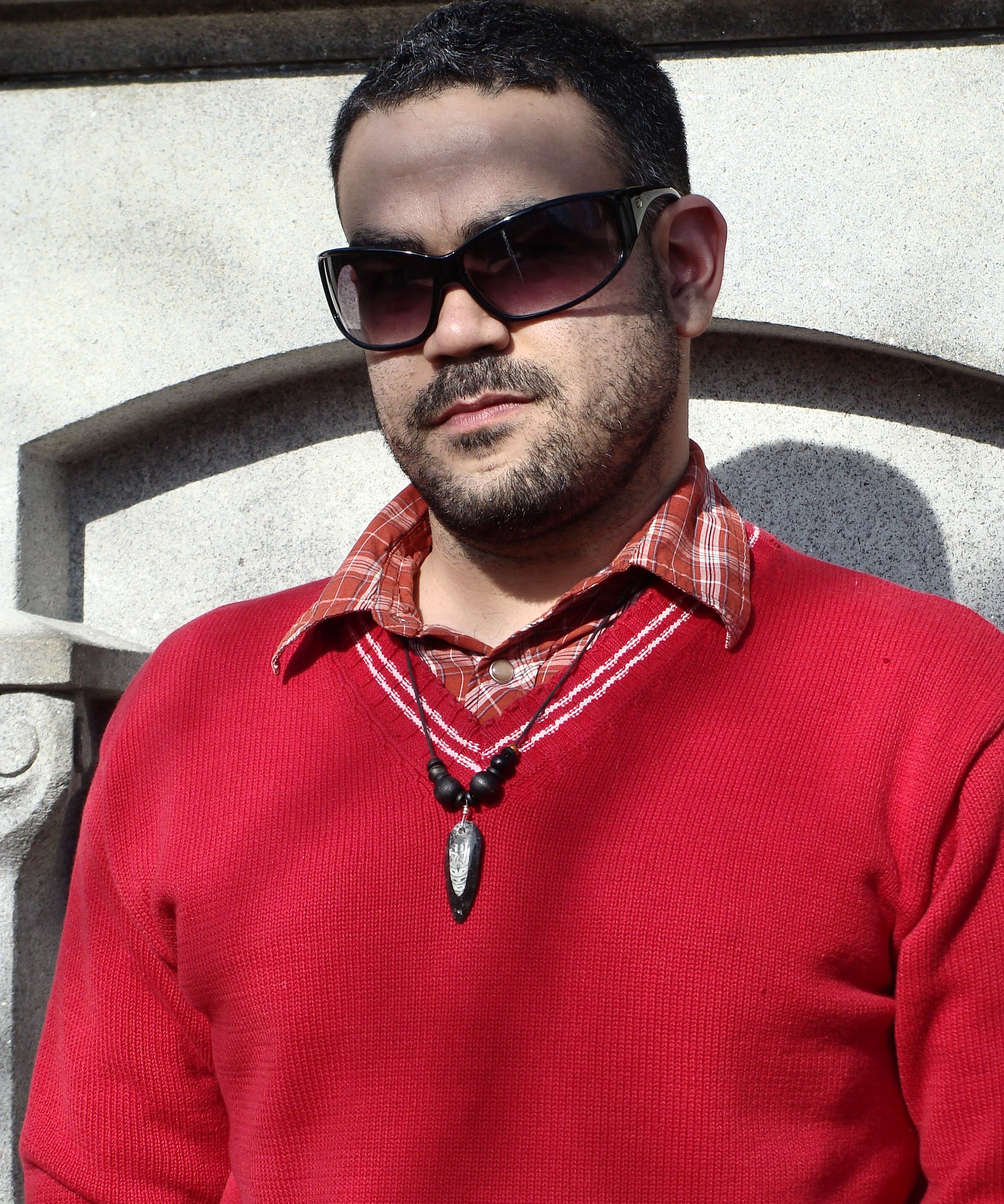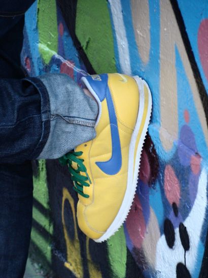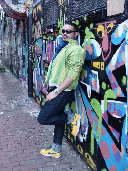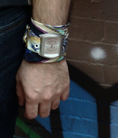 I’m not afraid to rock loud colors and the lime-green and blue vintage jacket (brand is Speedo Australia, it has a cool label too), the yellow, maize blue, green Nike Cortez “Brazil” sneakers and the watch prove this point. I got the jacket last spring at Dame Vintage in Jamaica Plain; the scarf is thrifted from Goodwill, the face of the watch is Neves, but the strap (interchangeable depending on look, mood, or in my case–sneakers) I made myself using old ties which I cut up, measured to appropriate length and had my mom sew it and add gromets and a buckle. The sunglasses are Oakley and I bought those from Oakley while a poor college student in New Hampshire.