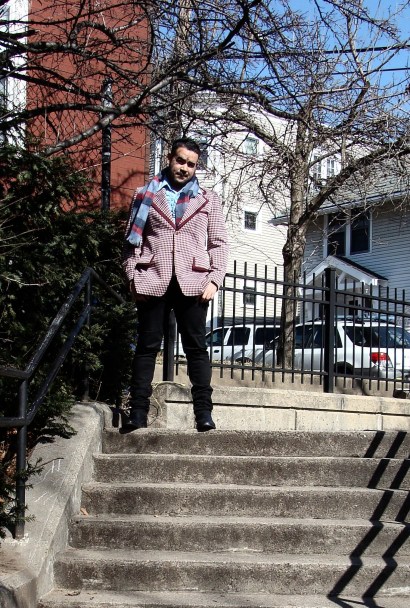 I wore this ensemble for the first time in 2010 out to dinner followed by a rocking concert by Florence and the Machine. I rocked it as much as Florence rocked her concert–and it felt super great! It is put together with mostly vintage pieces–Red plaid piped blazer (which I LOVE): I got at The Garment District in Cambridge, I think I paid less than $20 for it. It has attitude and never fails to get me a compliment or two. The blue ruffled tuxedo shirt has an interesting story (I’ll probably tell someday) and I bought it from the lovely Hilken Mancini over at 40 South St. in Jamaica Plain. The necklace is another awesome find. I found it by digging through a box full of jewelry at the SoWA Vintage and Antique Market in Boston. I paid a whooping $5 for it and as it turns out, even the stones are real! Jeans: Super Skinny Levi Jeans. Boots: Martin & Osa. Scarf: Thrifted at Goodwill.